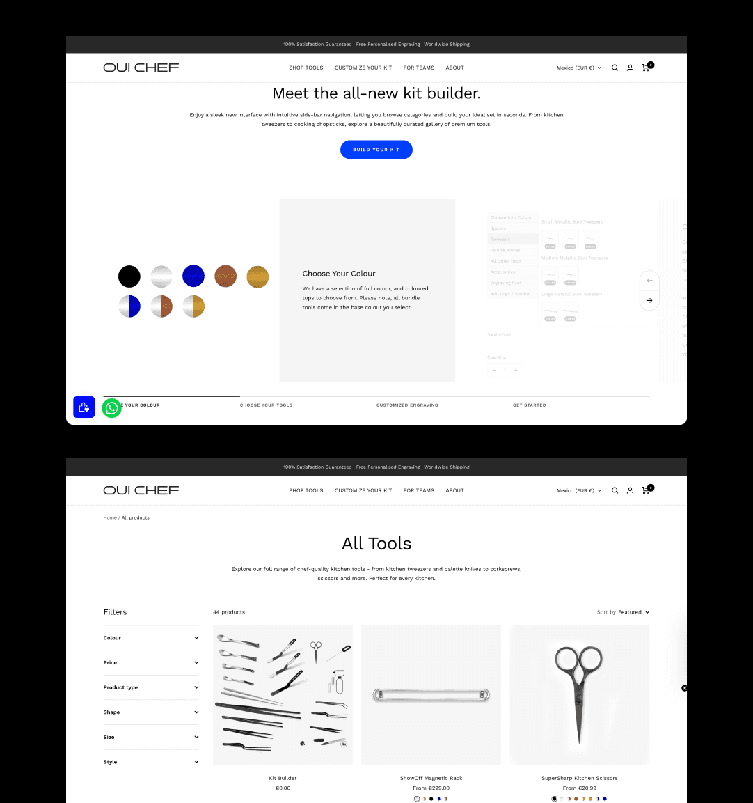 We started with the extended brand system. A refresh that kept the precision and professionalism Oui Chef was known for, while giving it a visual identity sharp enough to hold its own on screen and on shelf. The colour system, black, white, cobalt blue, and a hit of neon, gives the brand an edge that feels at home in a professional kitchen and a premium e-commerce context in equal measure. Photography was built around the tools in use. Close-up, considered, with the kind of attention to detail that mirrors the products themselves. Stop-motion and video added movement to the product story, showing exactly what these tools are capable of in the hands of someone who knows how to use them. The Shopify build brought it all together. A custom kit builder lets customers configure their own set, making the experience feel as considered as the products inside it. Clean navigation, rich product presentation, and a checkout journey that doesn't get in the way. The result is a digital experience that earns the premium price point before a single product goes in the basket.